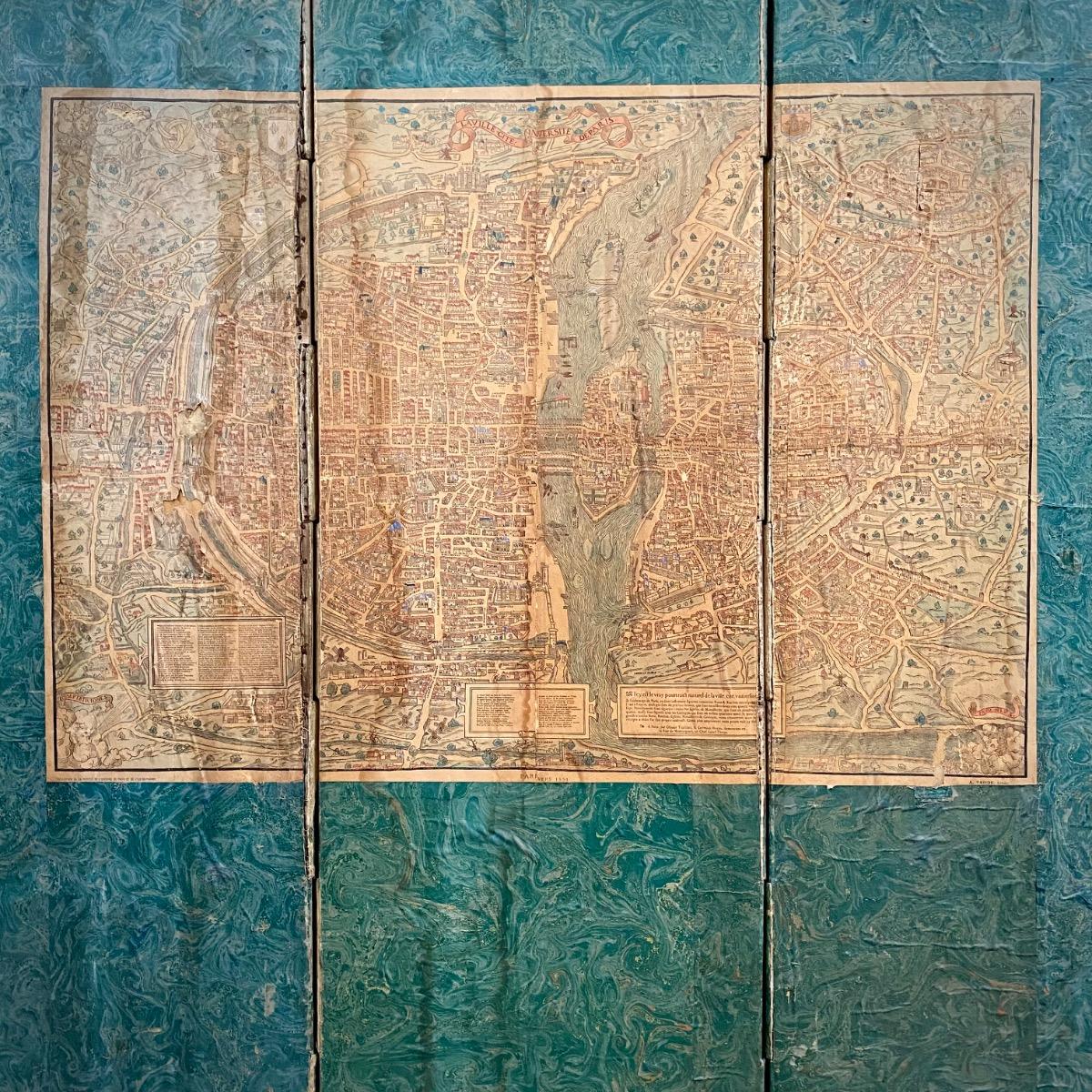 A decorative folding screen .. 3 panels of glued paper and fabrics with an old plan of Paris in a good attic condition…little bit worn on the bottom…probably first half 19thC…