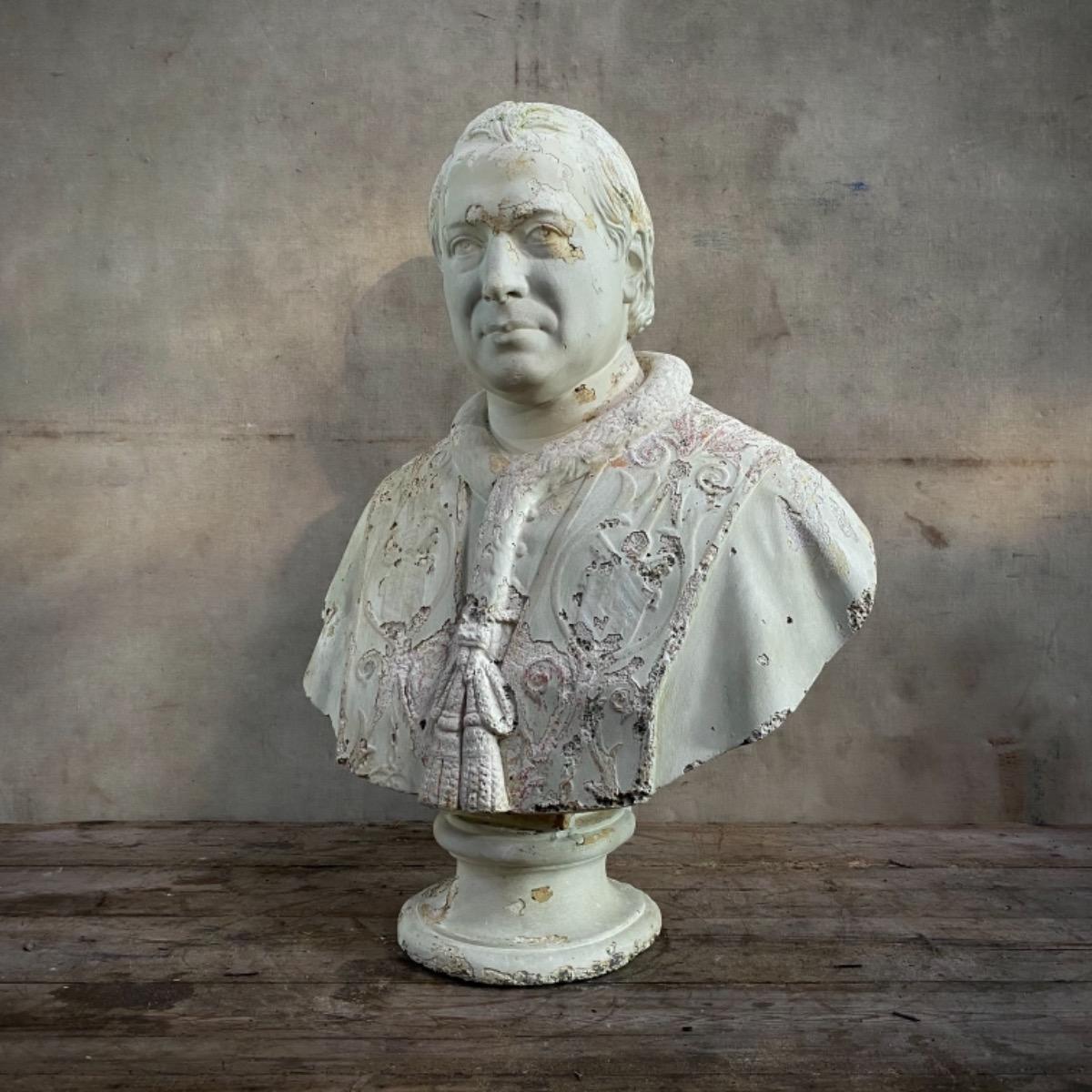 Large plaster bust of an ecclesiastical man …unusual weathered condition …faint traces of a primitive pictorial composition can be noted…back edge of the base is trimmed …good condition…it could be the pope Pie IX … France late 19thC …