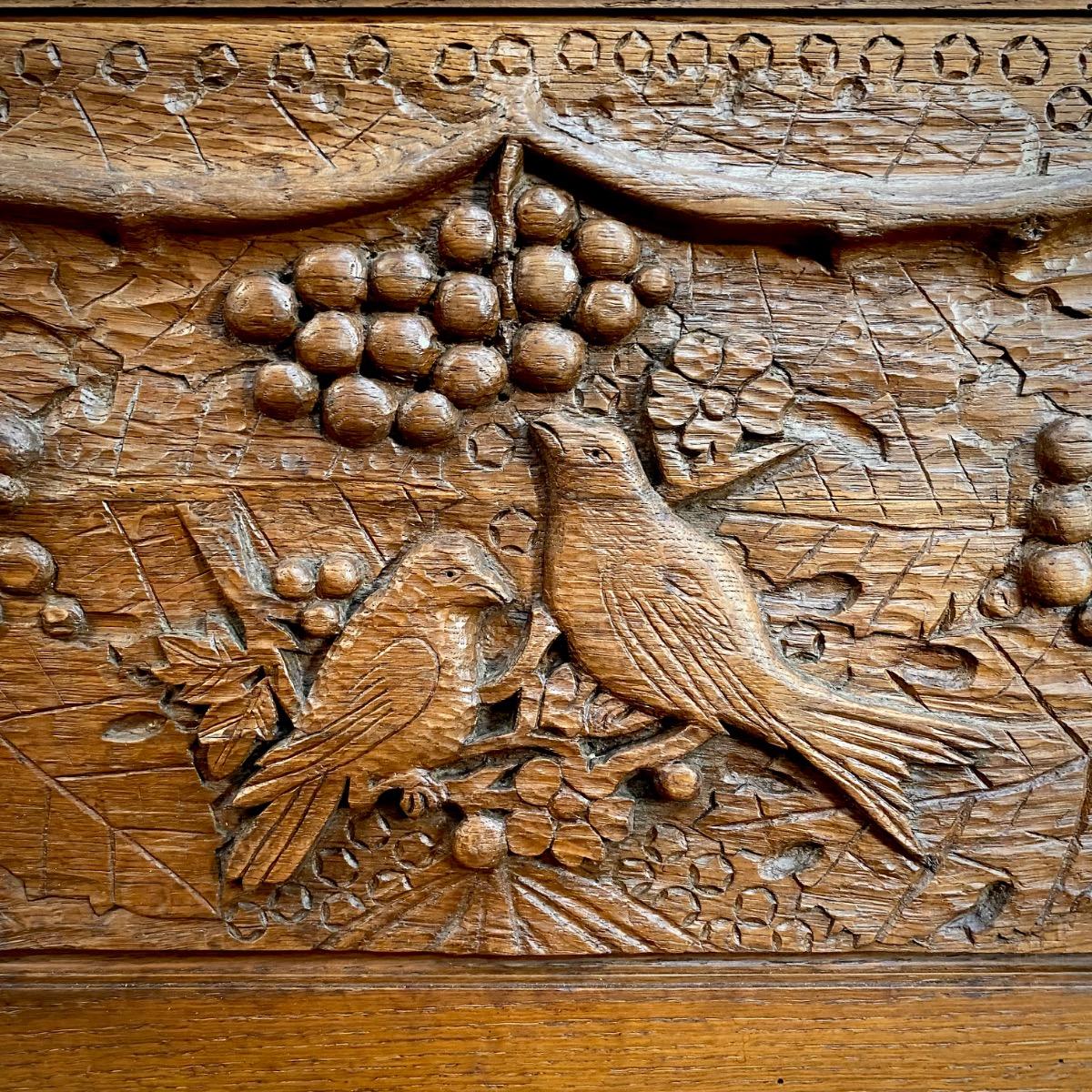 Stunning folk art oak cabinet…richly carved with multiple symbolism…top genuine condition…. France circa 1900…
