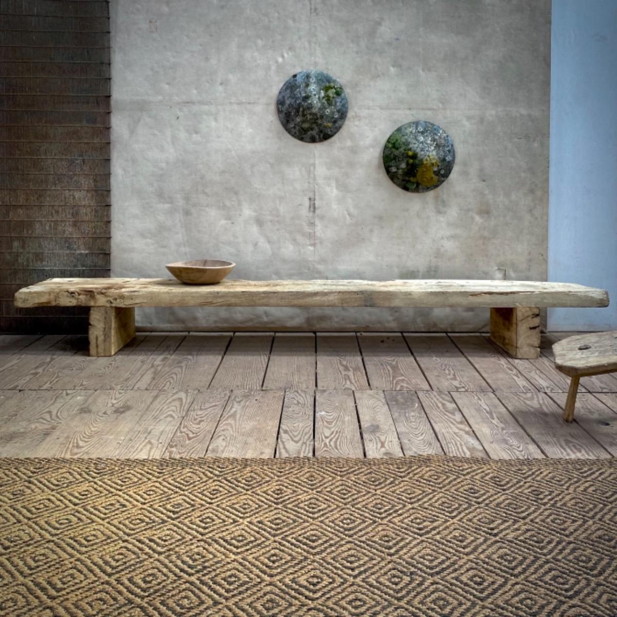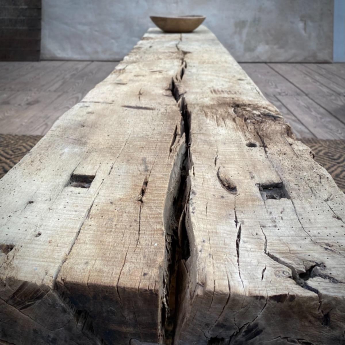 Low primitive workbench with a monoxyl beech top and oak legs ..can be now use as a nice low table or console …top thickness 2.7 inc … France circa 1900