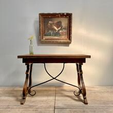 An interesting little oak spanish table with a folding & rotating top…can be used as an occasional table or console…size for the open square top is 43 x 43 in….Very good condition … France circa 1950