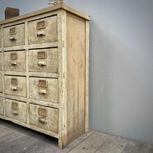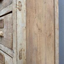 A cobbler chest of drawers with its great historical paint…all the drawers slide easily . The top is very clean cause it has long time been covered by a linoleum but too worn out to be saved...built without back to be leaned against a wall but now closed