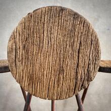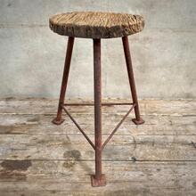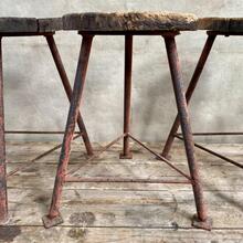 Set of 6 modernist stools .. tubular and solid iron base with remains of the historical paintings..Nice weathered oak seats ....very good condition...France circa 1950